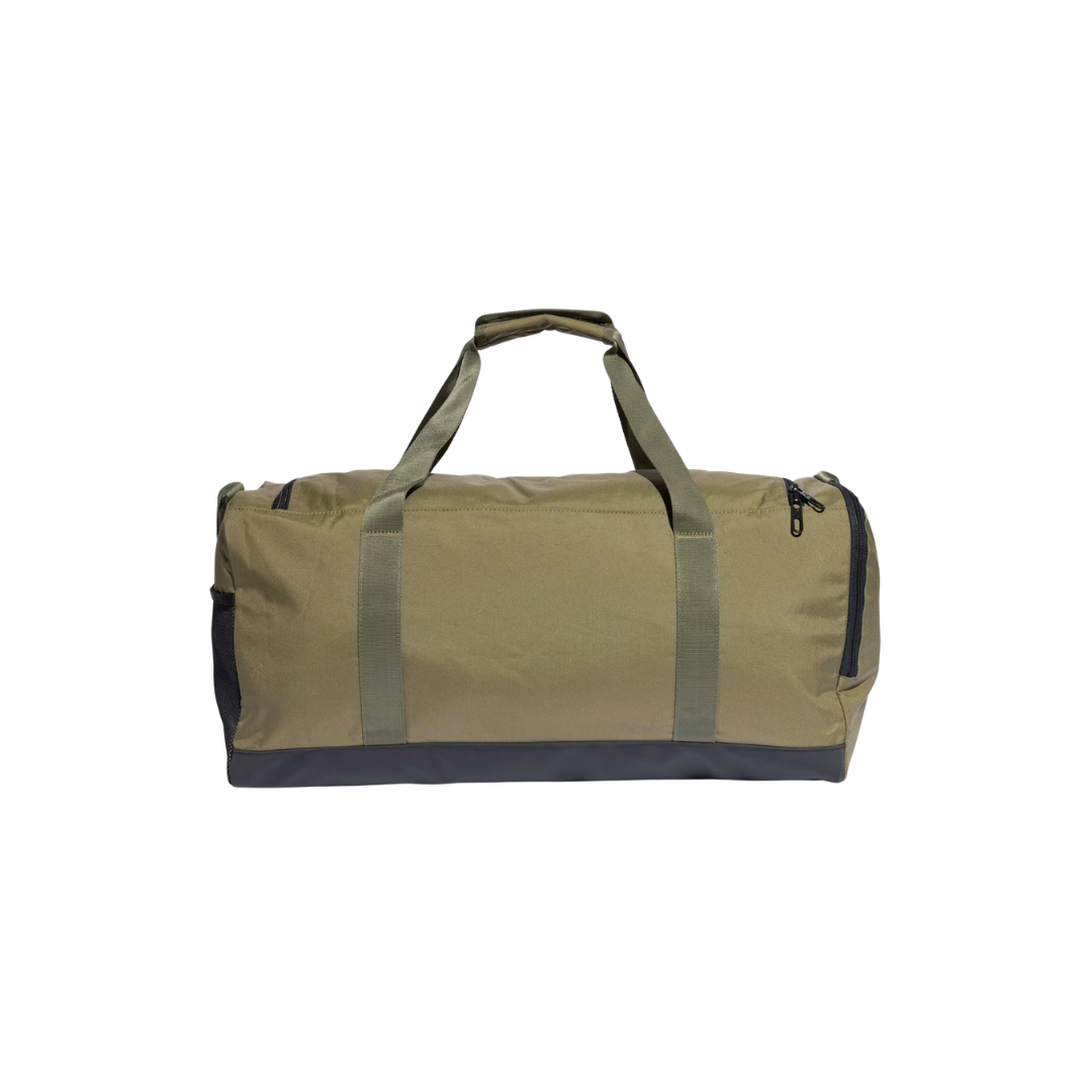 Bolso deportivo de diseño funcional y resistente, ideal para gimnasio, entrenamientos o escapadas cortas. Cuenta con compartimento principal amplio con cierre, bolsillo lateral de red para mejor organización y base reforzada que aporta mayor durabilidad. Incluye asas dobles y correa regulable para un transporte cómodo. Su diseño en tono verde oliva con logo adidas en contraste combina estilo, practicidad y versatilidad.