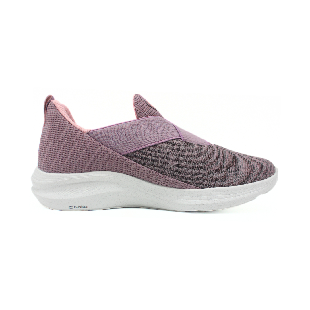Deportivo de dama estilo slip‑on, en tono rosa/lila con detalles en rosa claro. Cuenta con capellada de tejido knit liviano y banda elástica superior que facilita el calce sin cordones. Su suela blanca de gran espesor brinda buena amortiguación y comodidad, ideal para caminatas, uso diario o actividad ligera.