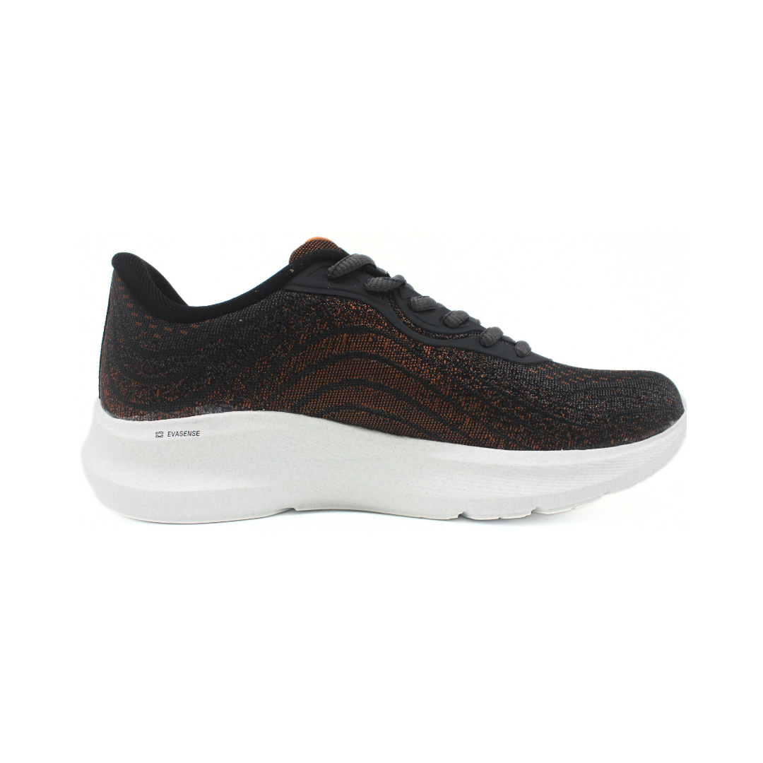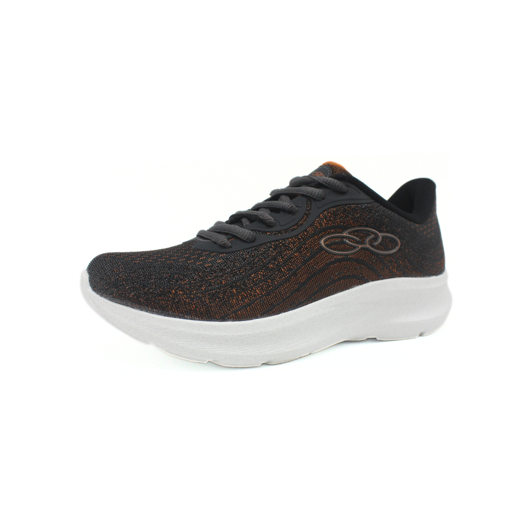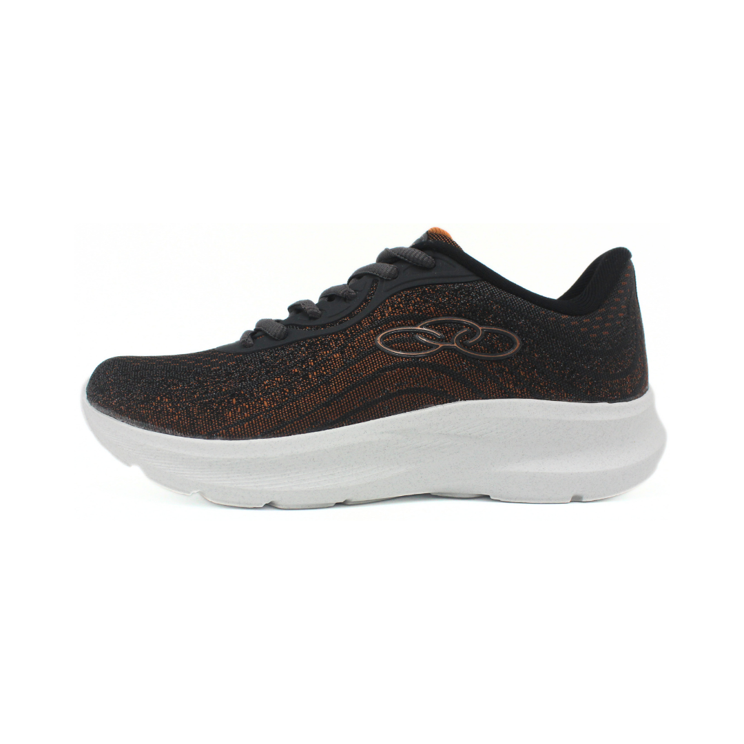 Deportivo Olimpikus de dama modelo Venus 3, en color negro con detalles en naranja. Cuenta con capellada de tejido knit liviano y respirable que brinda comodidad durante todo el día. Su suela blanca de gran espesor ofrece buena amortiguación y estabilidad, ideal para caminatas, entrenamiento ligero o uso diario.