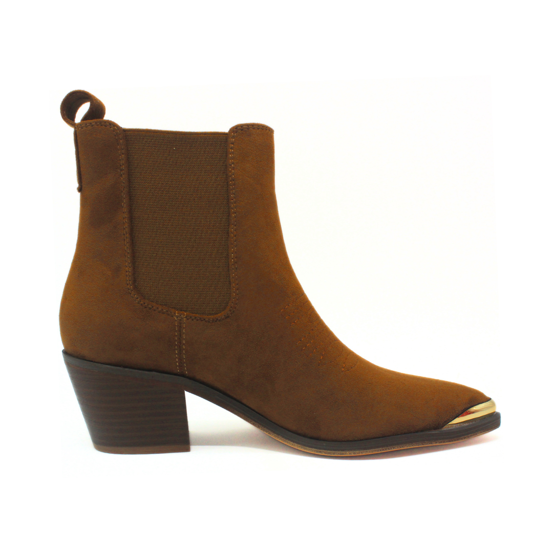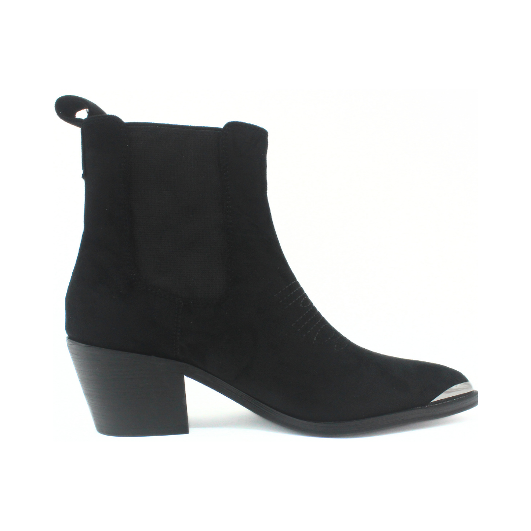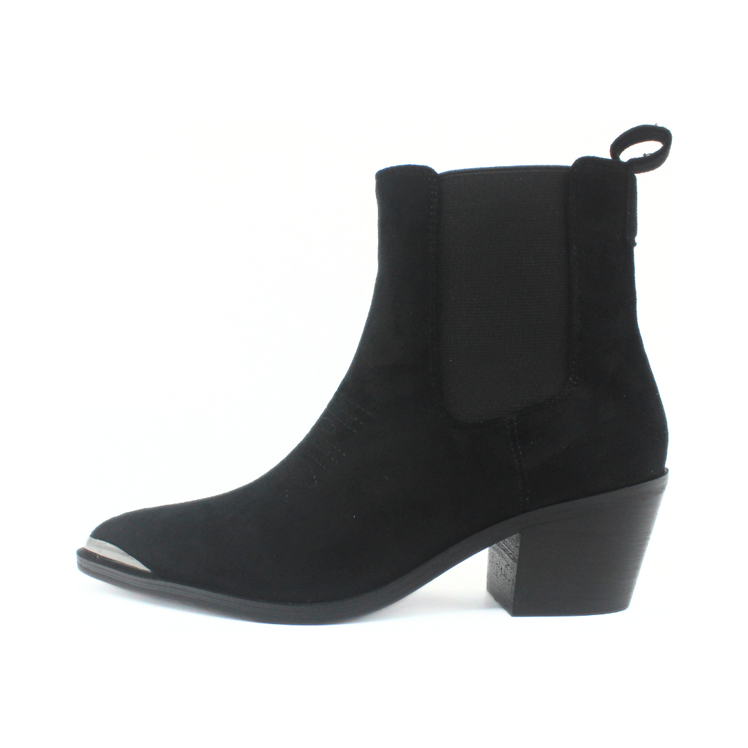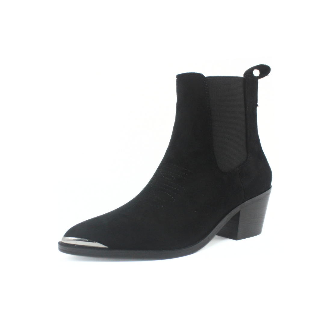 Bota de diseño moderno con inspiración texana. Presenta caña corta con elástico lateral que facilita el calce, punta fina con puntera metálica que aporta un toque distintivo y taco medio ancho que brinda estabilidad y comodidad. Un modelo versátil, ideal para looks urbanos y casuales con estilo.