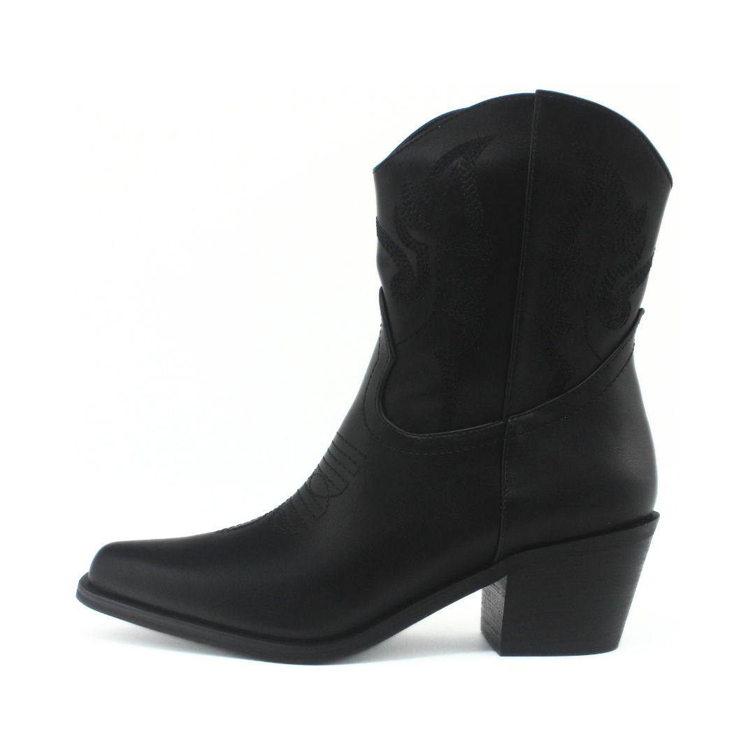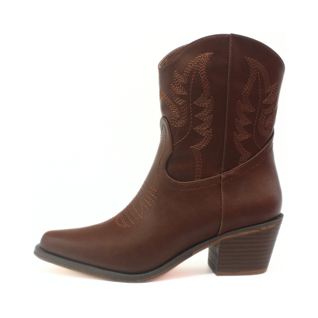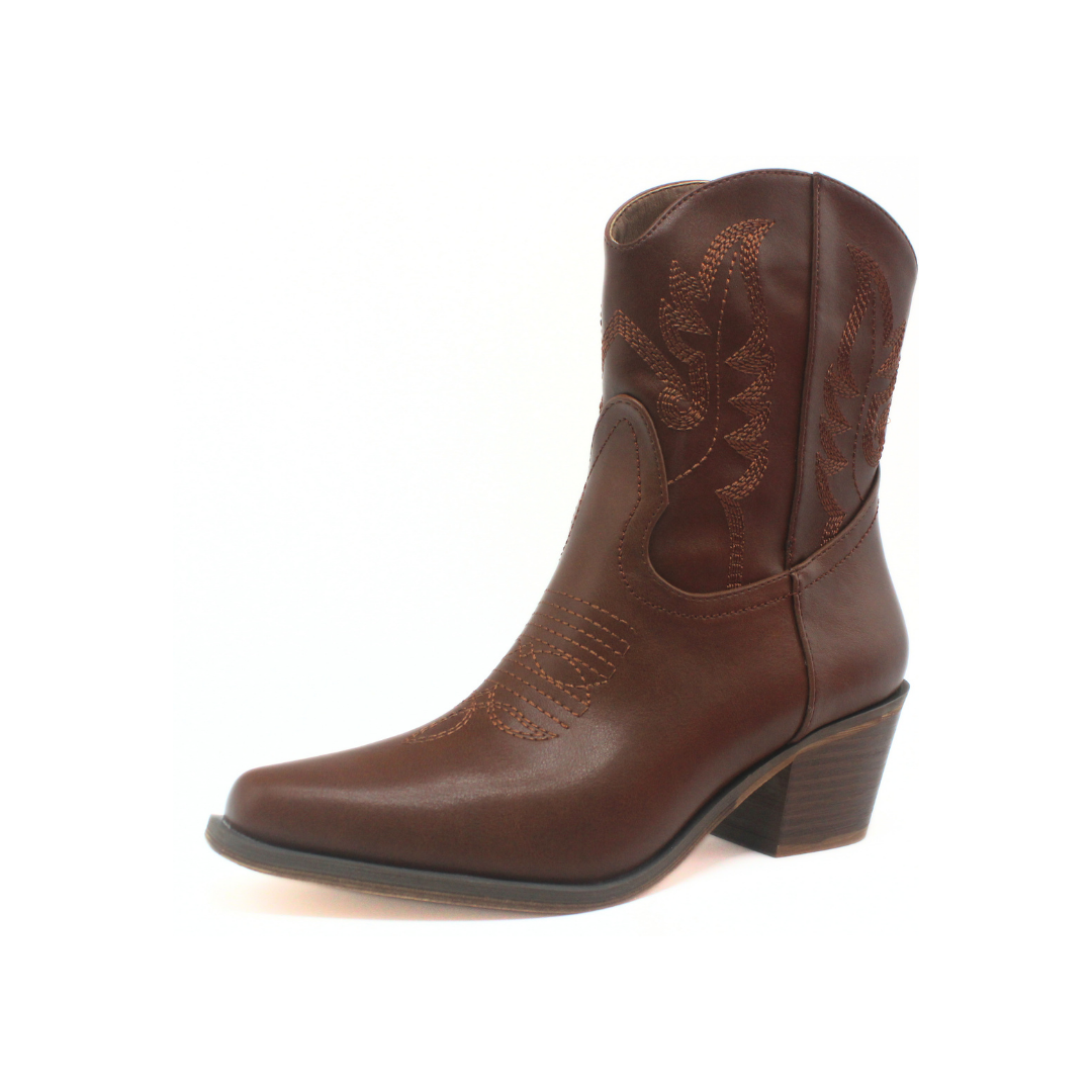 Bota de diseño texano clásico con bordados decorativos que aportan carácter y estilo. Presenta caña media, punta fina que estiliza el pie, taco medio ancho para mayor estabilidad y cierre lateral que facilita el calce. Un modelo versátil y cómodo, ideal para looks urbanos y casuales con personalidad.