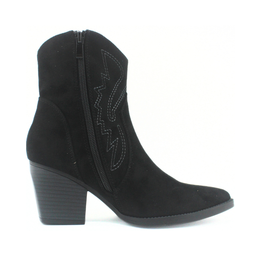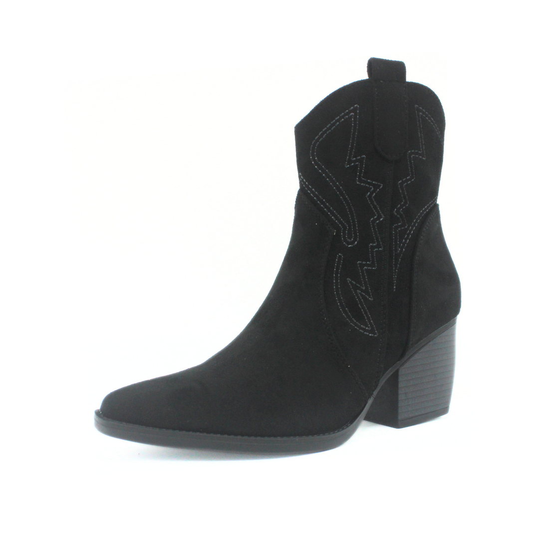Bota Panama Jack estilo texana confeccionada en material tipo gamuza, disponible en color suela y negro. Presenta caña media con bordados decorativos, cierre lateral para un calce práctico y puntera levemente afinada. Su taco medio de madera brinda altura y estabilidad, ideal para looks urbanos y casuales con estilo.