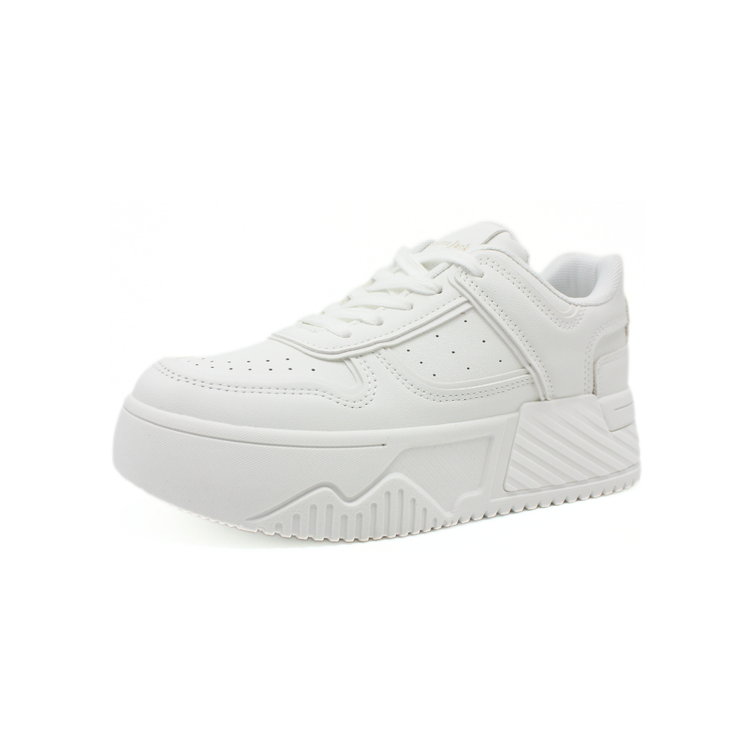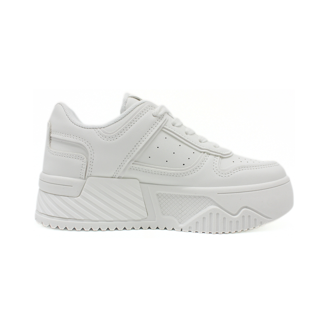 Deportivo Panama Jack de dama en color blanco, con diseño moderno tipo chunky. Confeccionada en material sintético con perforaciones laterales que aportan ventilación. Cuenta con cordones clásicos y una suela plataforma de gran volumen que brinda comodidad, estabilidad y un look urbano actual. Ideal para uso diario y outfits casuales.