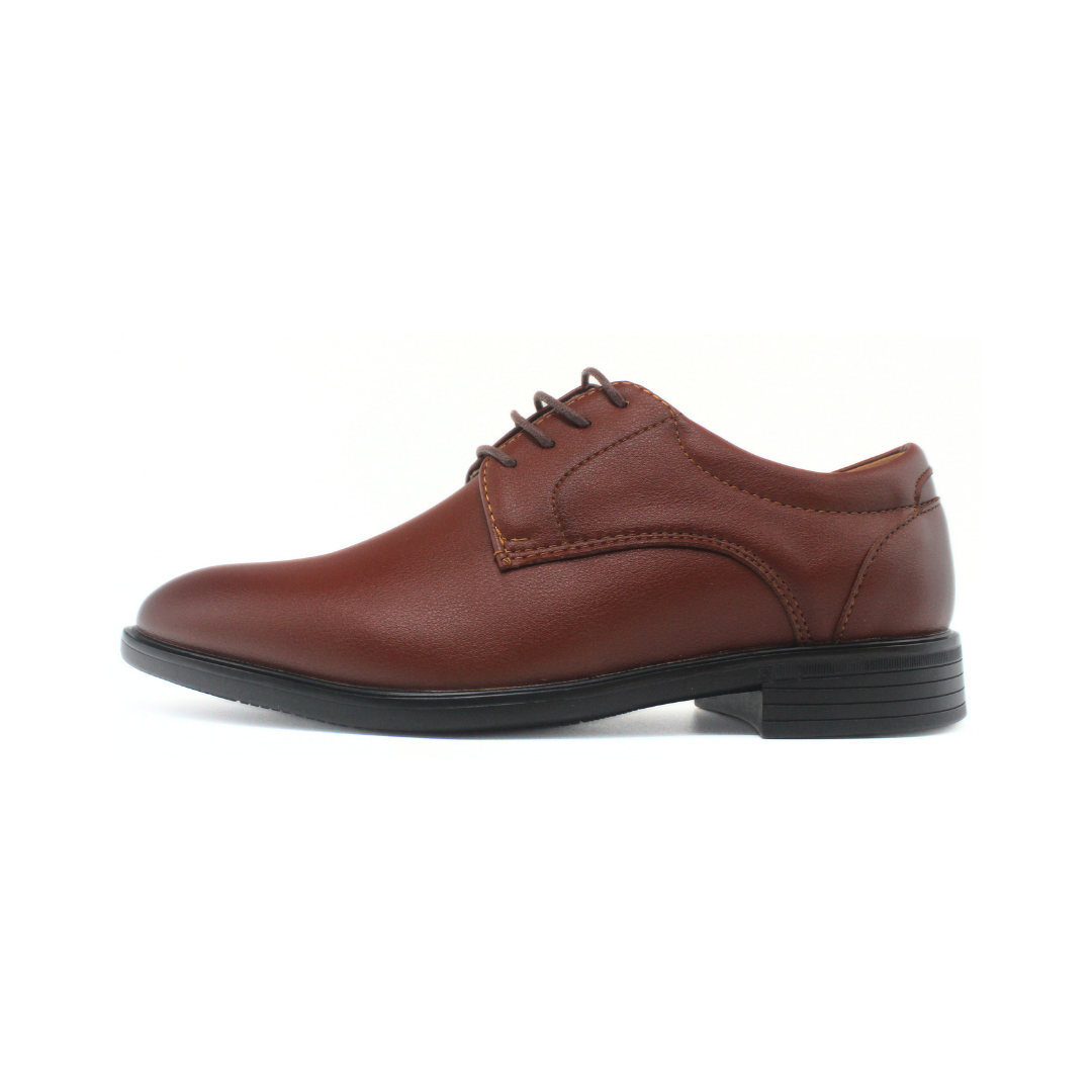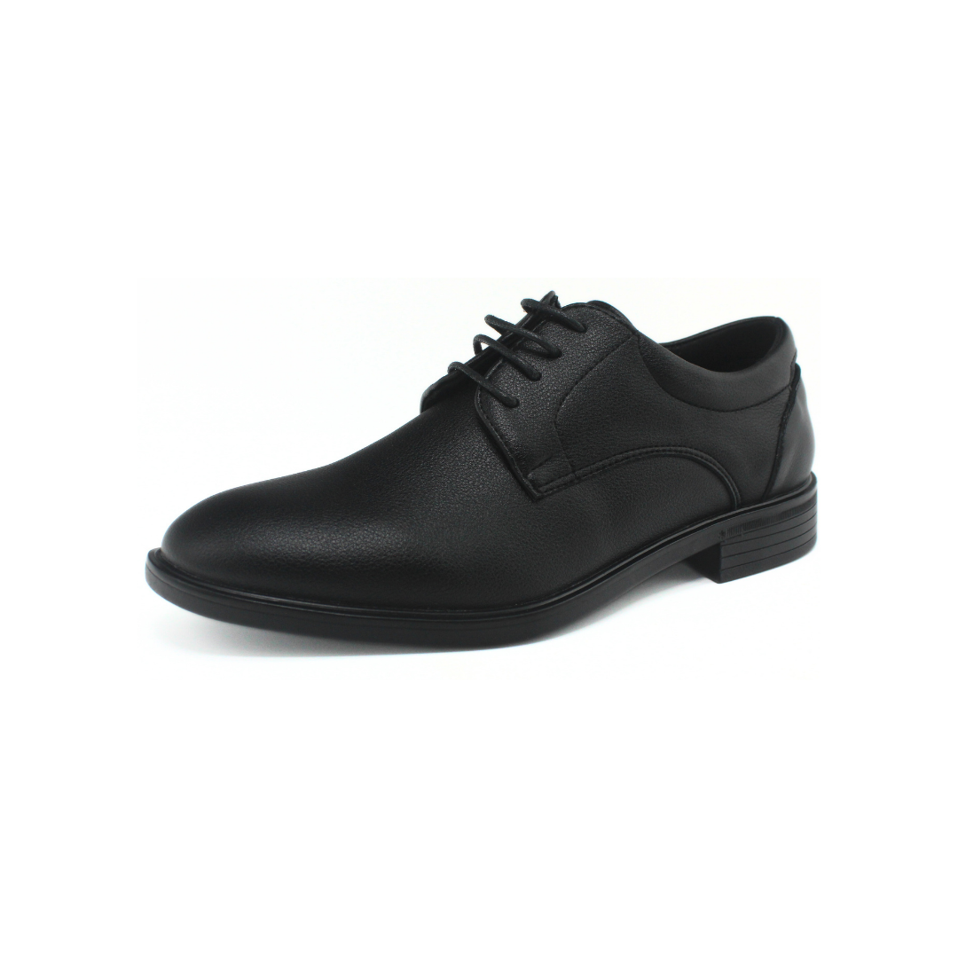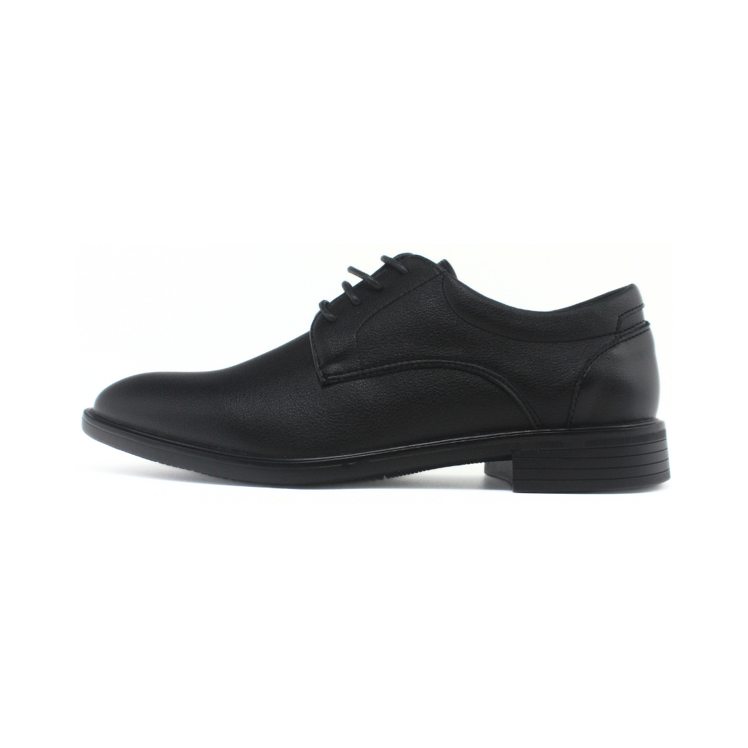 Zapato clásico de vestir, confeccionado en material sintético de acabado suave. Presenta diseño con cordones, puntera redondeada y detalles de costuras decorativas en los laterales. Su suela firme con base en tono madera aporta estabilidad y un estilo elegante, ideal para uso formal o laboral.