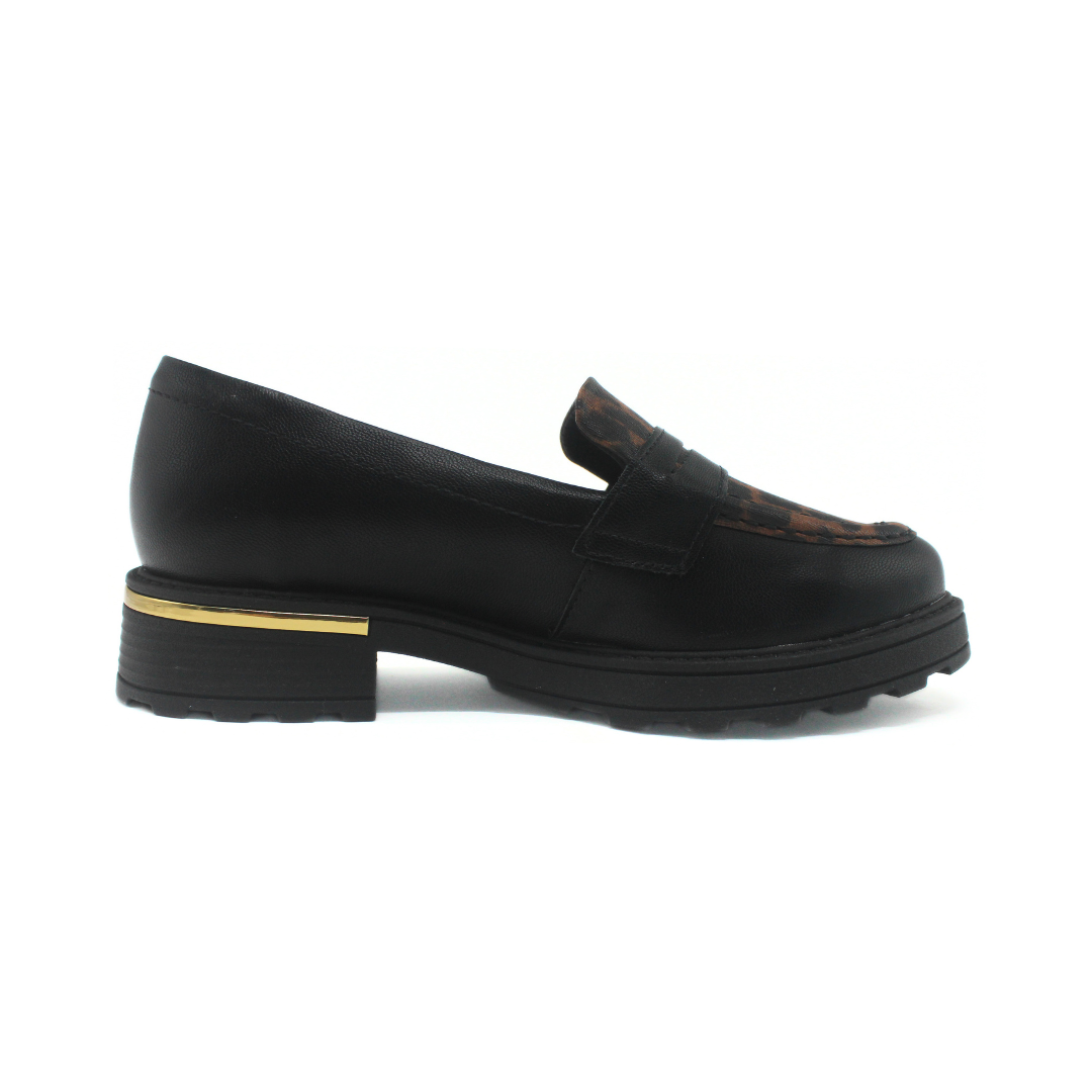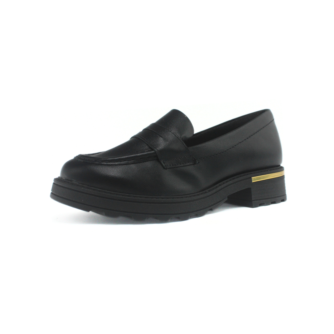 Zapato de estilo moderno con detalle distintivo. Presenta diseño tipo mocasín, empeine con combinación de texturas, taco medio ancho con aplique metálico que aporta estabilidad y una base robusta pensada para mayor comodidad. Ideal para sumar estilo y personalidad a looks urbanos o laborales.