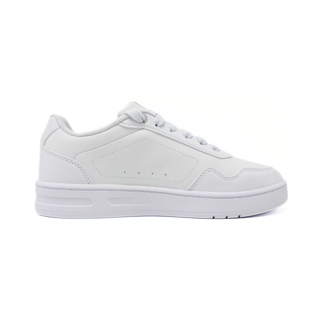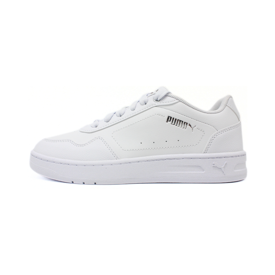 Deportivo urbano en color blanco con un diseño limpio y uniforme que destaca por su estética minimalista. La capellada sintética presenta una textura suave y detalles perforados que acompañan la línea lateral. La base de perfil bajo mantiene una pisada cómoda para el uso diario, mientras que el logo Puma en tono plateado suma un toque sutil al conjunto. Un modelo versátil, moderno y fácil de combinar con cualquier look casual.