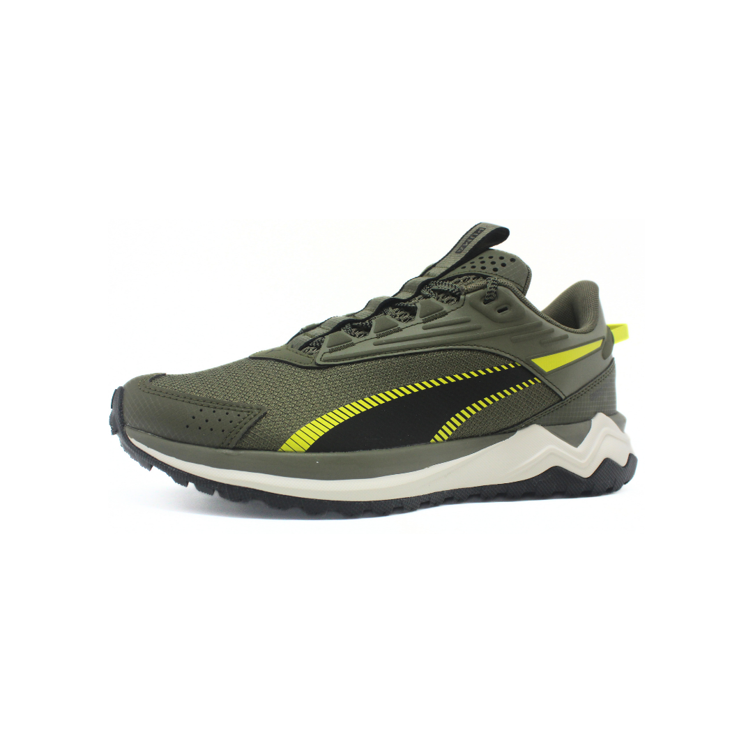 Deportivo Puma de hombre modelo Extend Lite Trail, en color verde oliva con detalles en negro y lima. Cuenta con capellada de malla resistente con refuerzos sintéticos para mayor durabilidad. Su suela robusta con diseño dentado brinda buen agarre y estabilidad, ideal para caminatas, uso outdoor ligero o uso diario con estilo deportivo.
