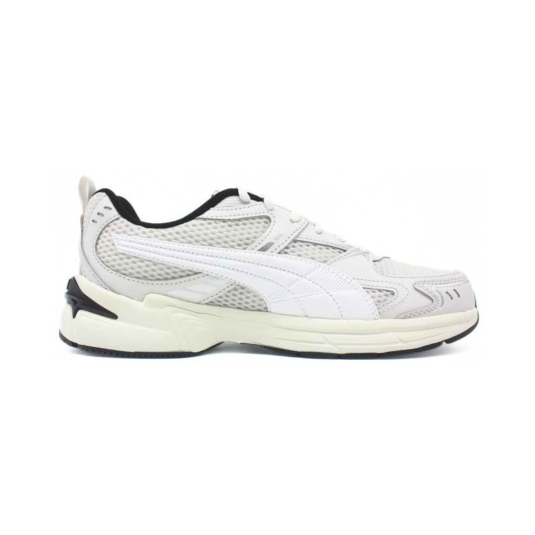 Deportivo en tono gris claro con detalles en blanco y plateado que aportan una estética moderna y técnica. La capellada combina mesh con refuerzos sintéticos que acompañan el diseño dinámico del modelo. La franja lateral característica de Puma se integra de forma fluida sobre la silueta. La entresuela de perfil marcado suma presencia y acompaña el paso con una sensación estable, mientras que los detalles en negro en el talón refuerzan el look urbano. Un modelo actual y versátil para rutinas activas y uso diario.