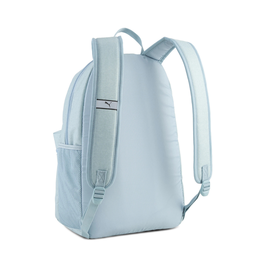 Mochila en color celeste pastel, ideal para uso diario. Cuenta con un compartimento principal amplio y un bolsillo frontal con cierre para organizar objetos esenciales. Incluye bolsillo lateral de red para llevar botella y tiras acolchadas ajustables que brindan comodidad durante el uso. El logo Puma frontal aporta un estilo moderno y deportivo.