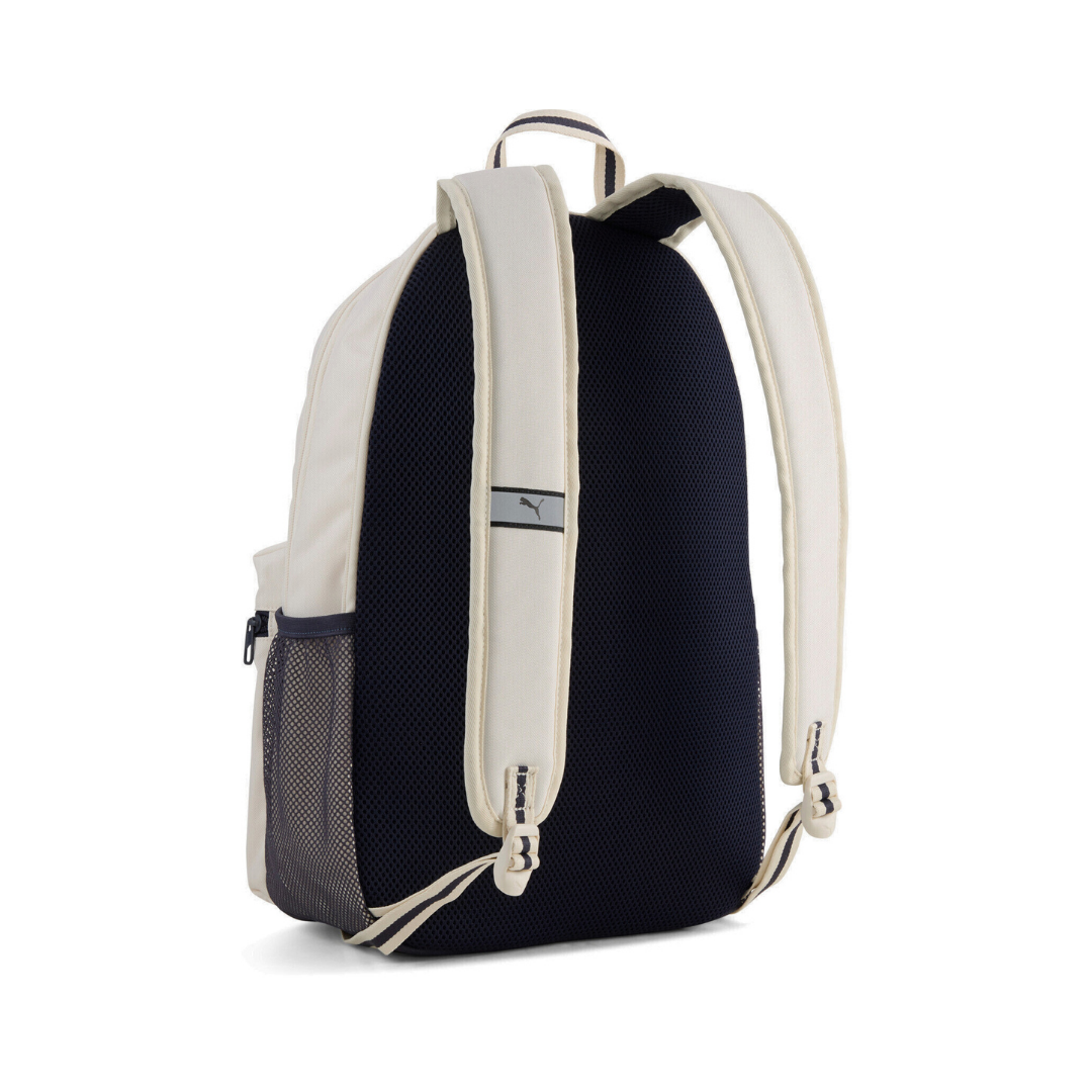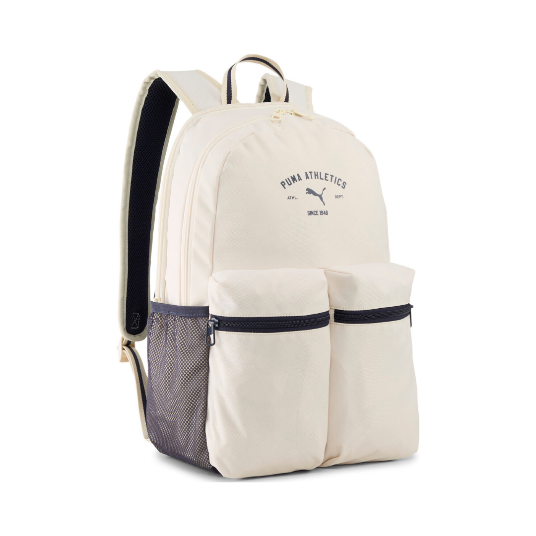 Mochila en tono beige con detalles en azul marino, ideal para uso diario o escolar. Cuenta con dos bolsillos frontales amplios con cierre, bolsillo lateral de red y compartimento interno con funda para laptop. Las tiras acolchadas y el panel trasero de malla brindan comodidad durante el uso. El diseño incluye el logo «Puma Athletics Since 1948», que aporta un estilo moderno y urbano.