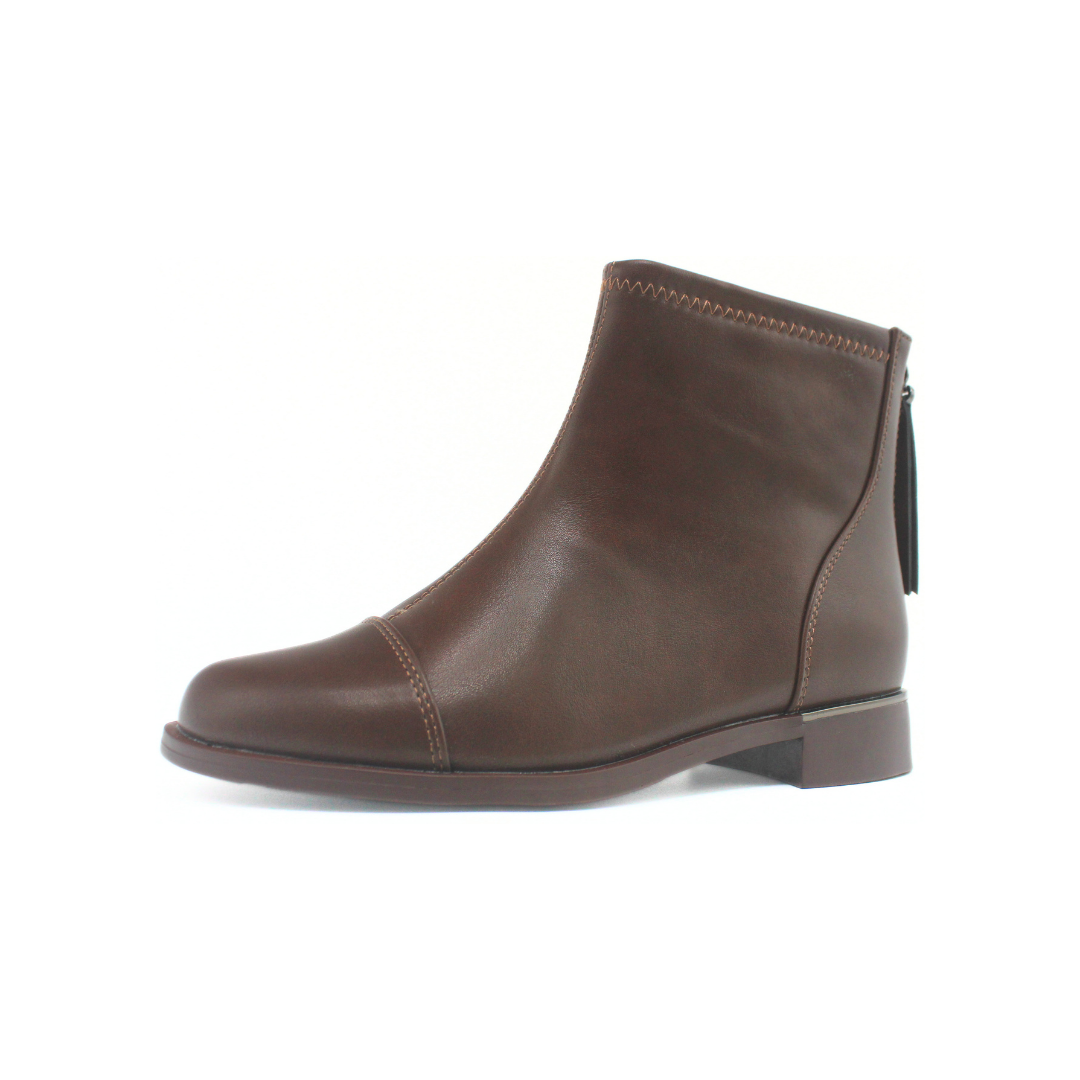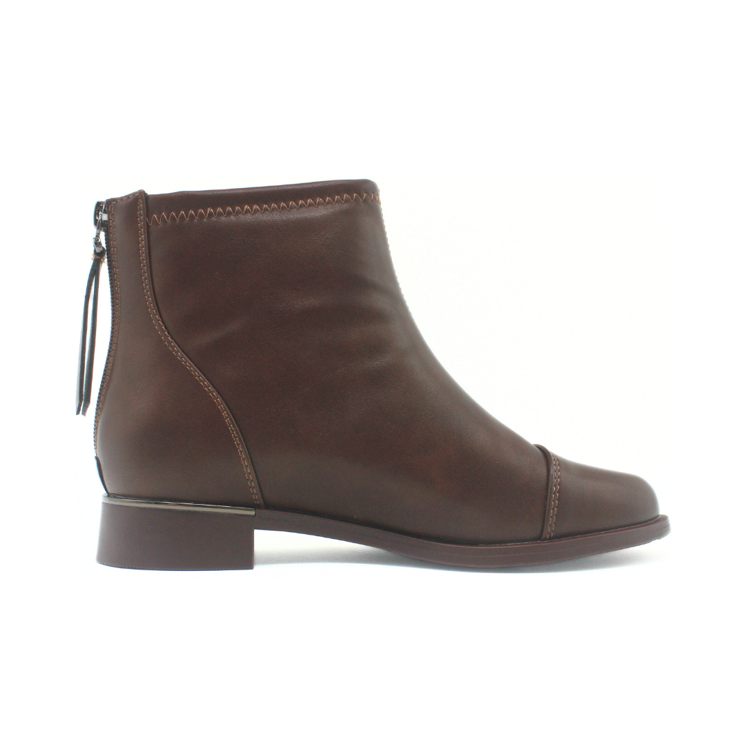 Bota con una silueta de caña baja y diseño sobrio de líneas definidas. La capellada presenta una textura lisa y uniforme, acompañada por costuras visibles que aportan un detalle prolijo. Incluye cierre trasero con tirador decorativo que suma estilo y facilita el calce. La base con taco bajo y perfil recto mantiene un look equilibrado y cómodo para el uso diario. Un modelo versátil, ideal para completar outfits urbanos y de temporada.