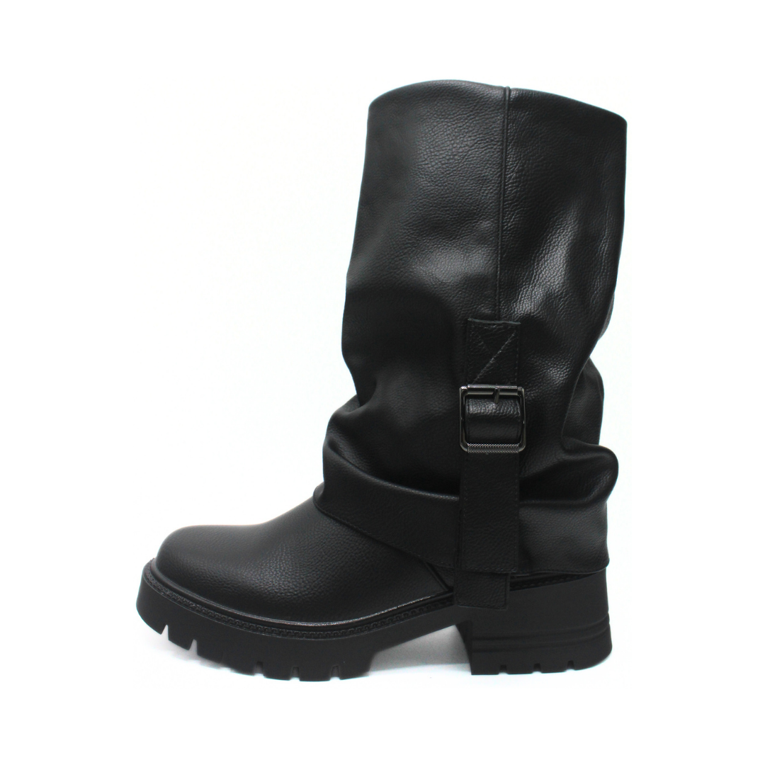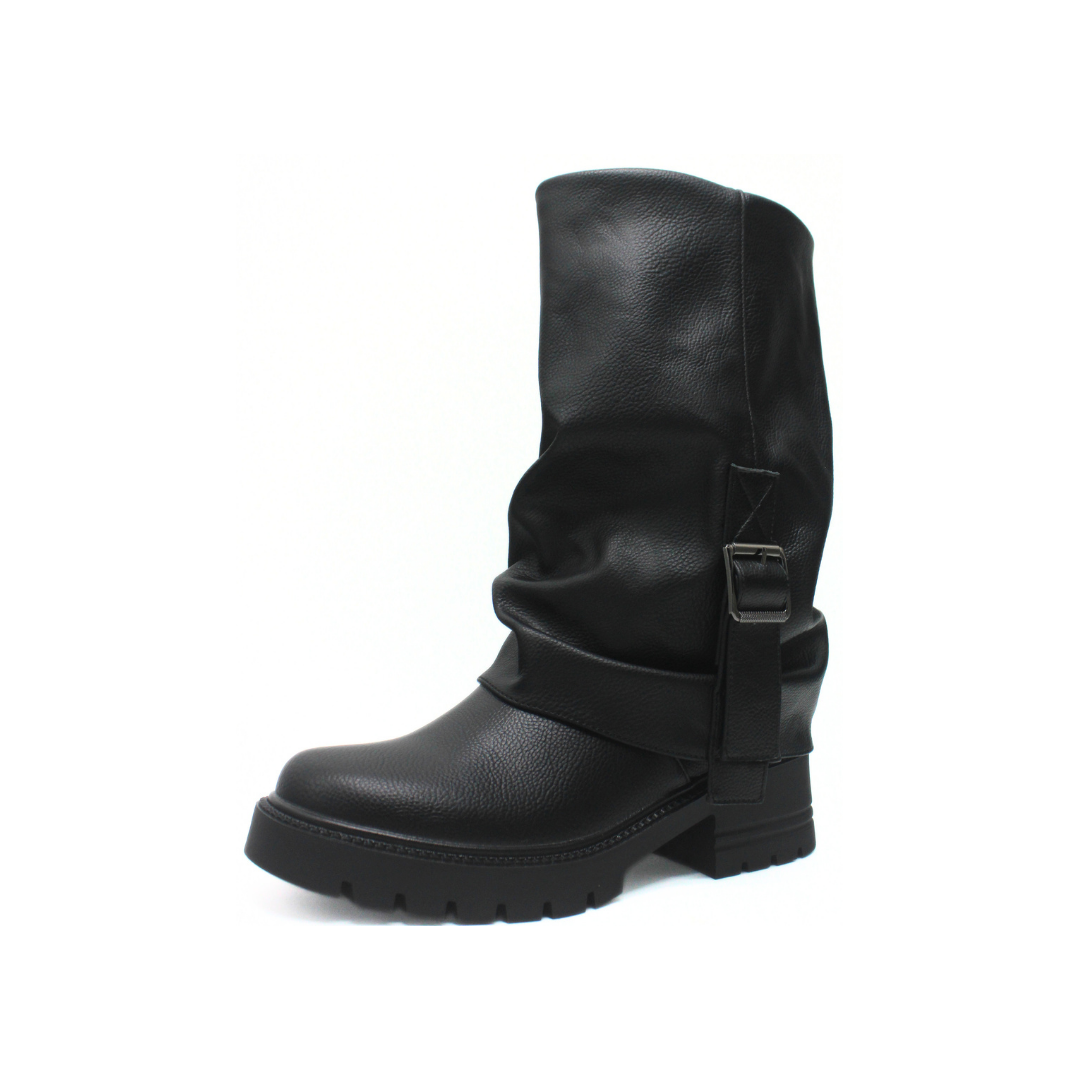Bota caña media y una silueta relajada que aporta un estilo urbano con personalidad. La capellada presenta una textura suave con un leve efecto arrugado que le da un look moderno y actual. Incorpora una tira envolvente con hebilla lateral que suma un detalle distintivo al diseño. El cierre interno facilita el calce y mantiene una apariencia prolija. La base con suela dentada y taco bajo completa un perfil equilibrado, ideal para acompañar outfits de temporada con comodidad y carácter.