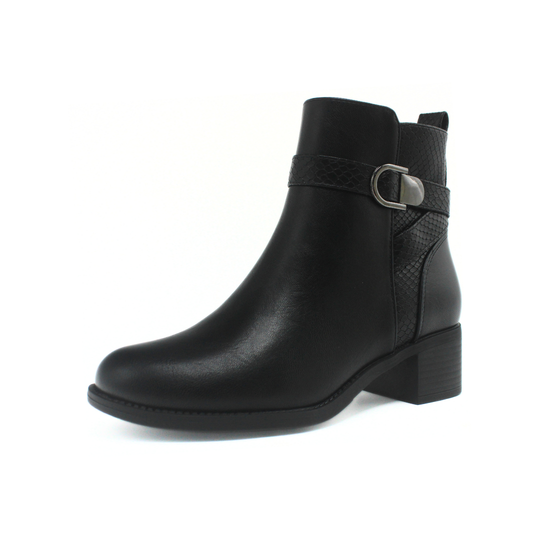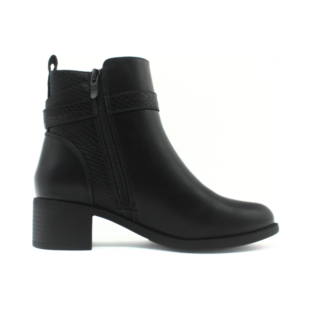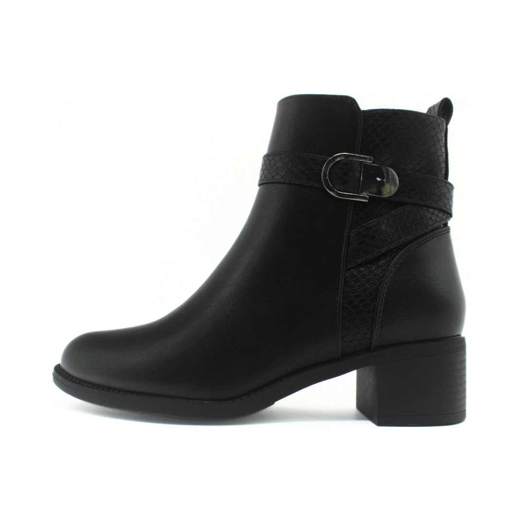 Bota con diseño de caña baja y líneas definidas que aportan una estética elegante y moderna. La capellada presenta un acabado liso combinado con un detalle de textura en la parte trasera, sumando un contraste sutil al diseño. Incluye tira con hebilla lateral que aporta un toque distintivo y cierre interno para un calce práctico. El taco ancho de altura media acompaña la pisada y completa un perfil equilibrado, ideal para looks urbanos y de temporada.