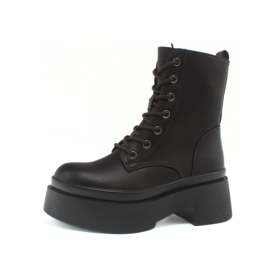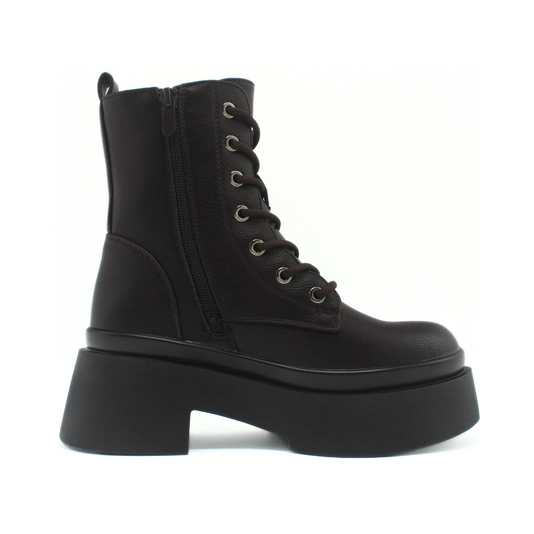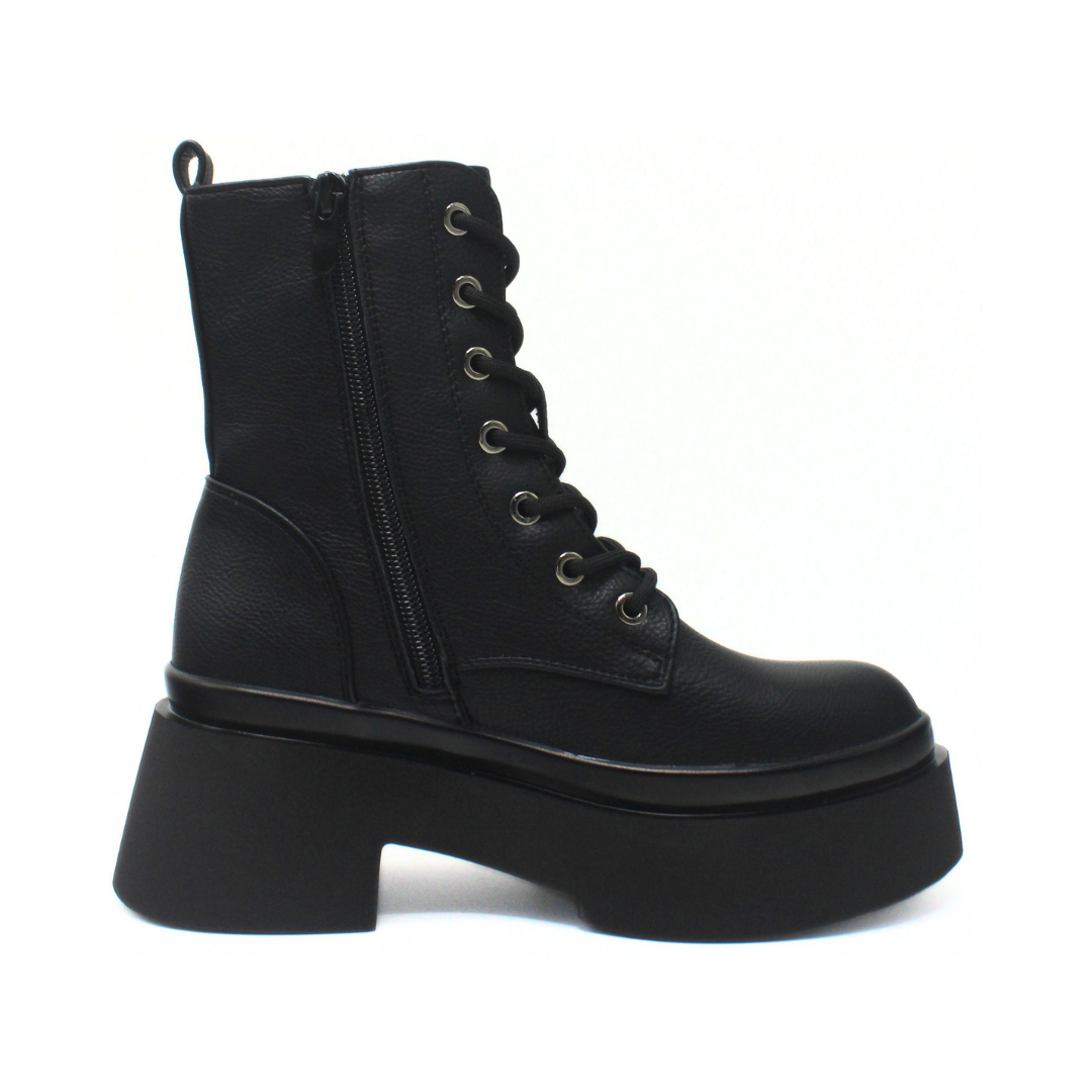 Bota con diseño de caña media y una silueta marcada que aporta presencia y estilo. La capellada presenta una textura suave y uniforme, acompañada por cordones frontales con ojalillos metálicos que refuerzan su estética urbana. Incluye cierre lateral interno que facilita el calce y mantiene una apariencia prolija. La base elevada con plataforma y taco ancho suma un perfil moderno y definido, ideal para completar looks de temporada con actitud.
