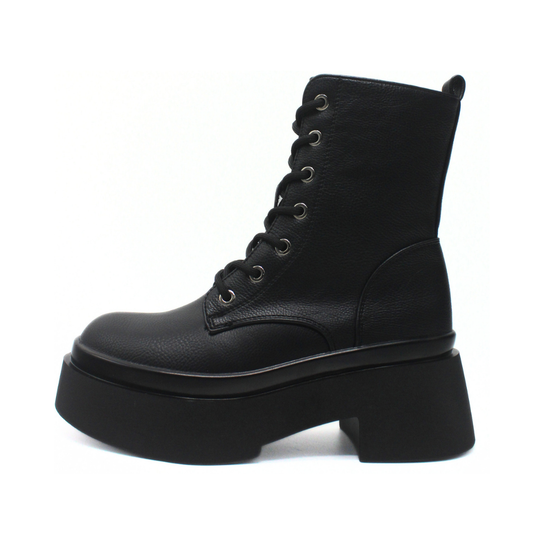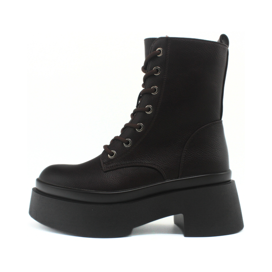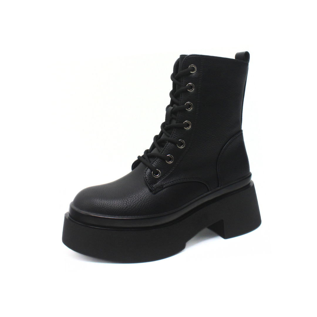 Bota con diseño de caña media y una silueta marcada que aporta presencia y estilo. La capellada presenta una textura suave y uniforme, acompañada por cordones frontales con ojalillos metálicos que refuerzan su estética urbana. Incluye cierre lateral interno que facilita el calce y mantiene una apariencia prolija. La base elevada con plataforma y taco ancho suma un perfil moderno y definido, ideal para completar looks de temporada con actitud.