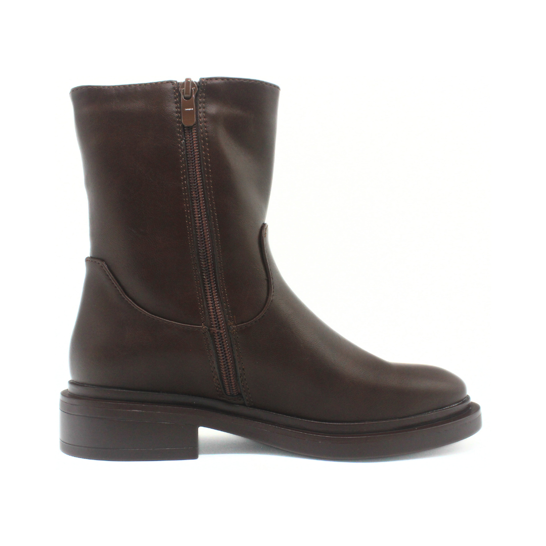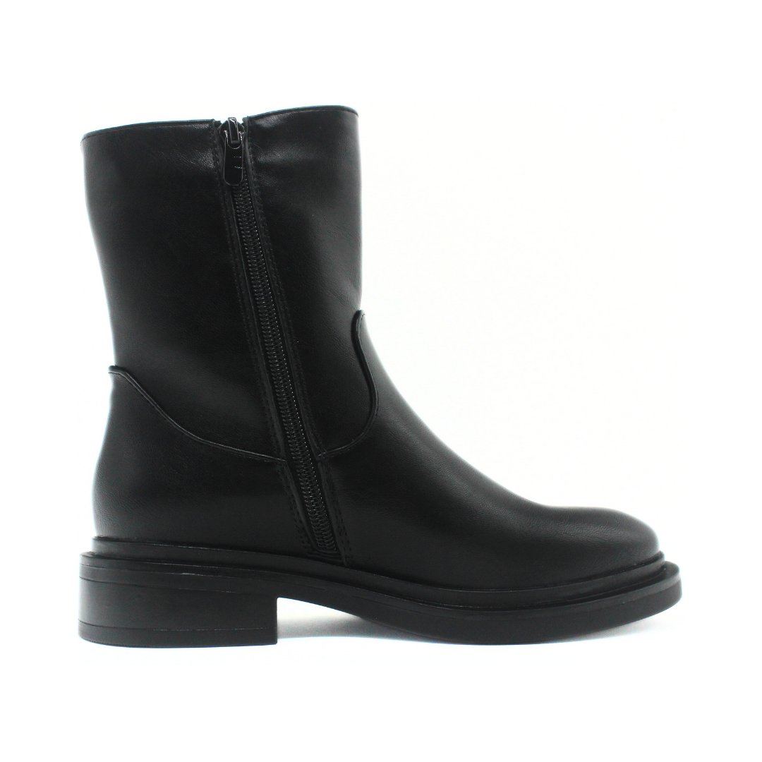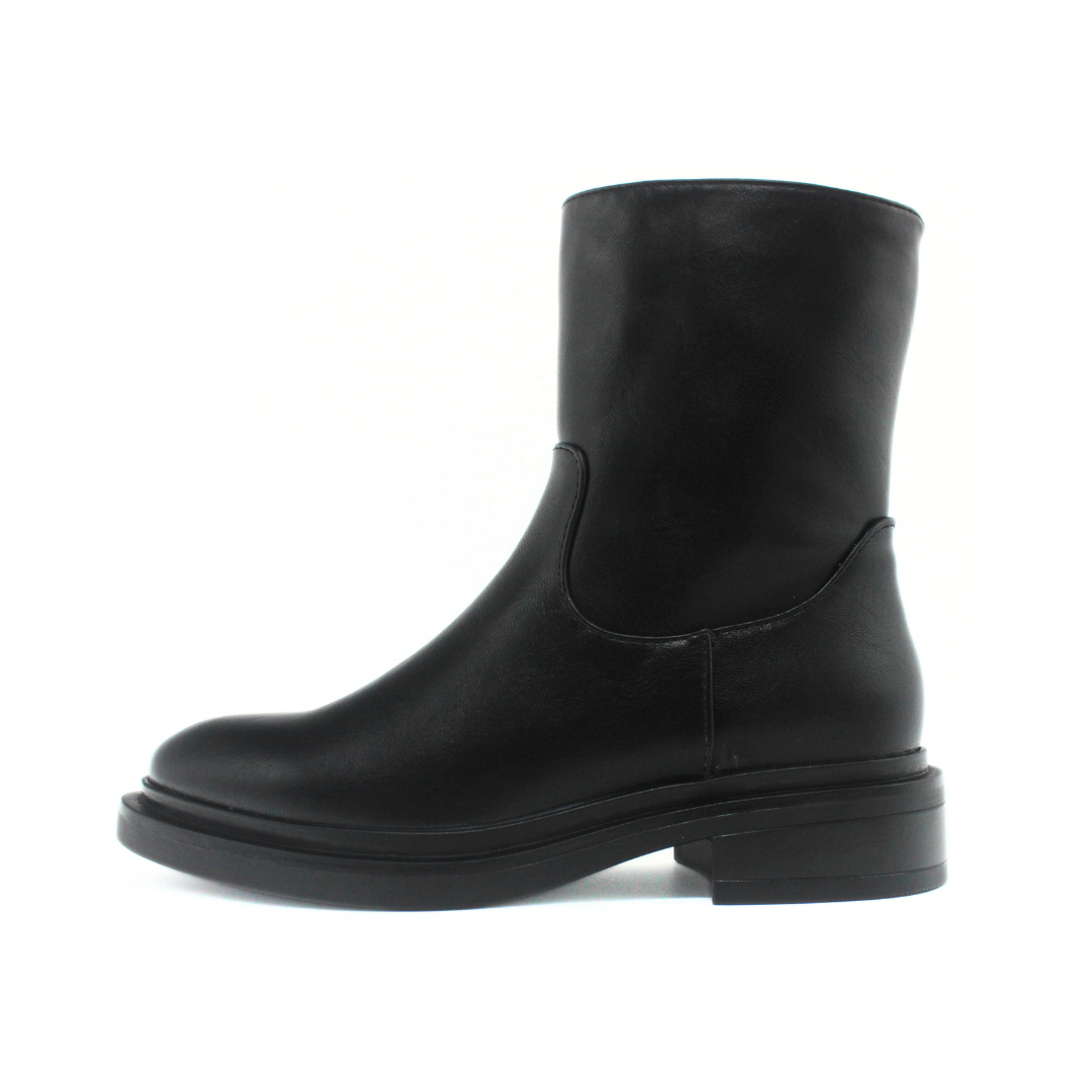Bota con una silueta limpia y caña media que aporta un look moderno y minimalista. Presenta una capellada lisa de textura suave y un diseño sin costuras visibles en la parte frontal, creando una estética uniforme. El cierre lateral facilita el calce, mientras que la base ancha y el taco bajo ofrecen comodidad para el uso diario. Un modelo versátil para complementar outfits urbanos y de temporada.