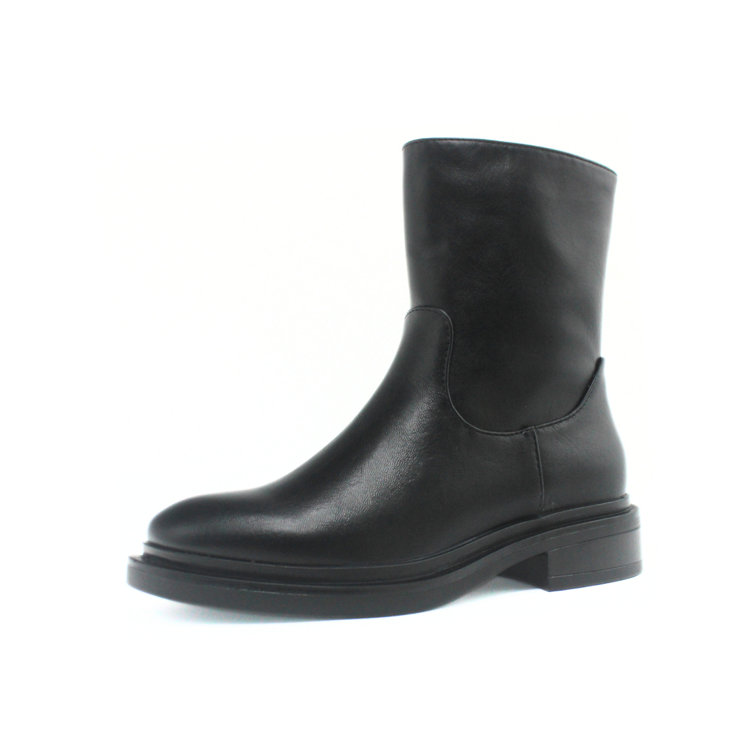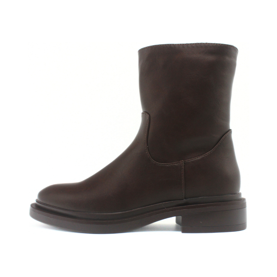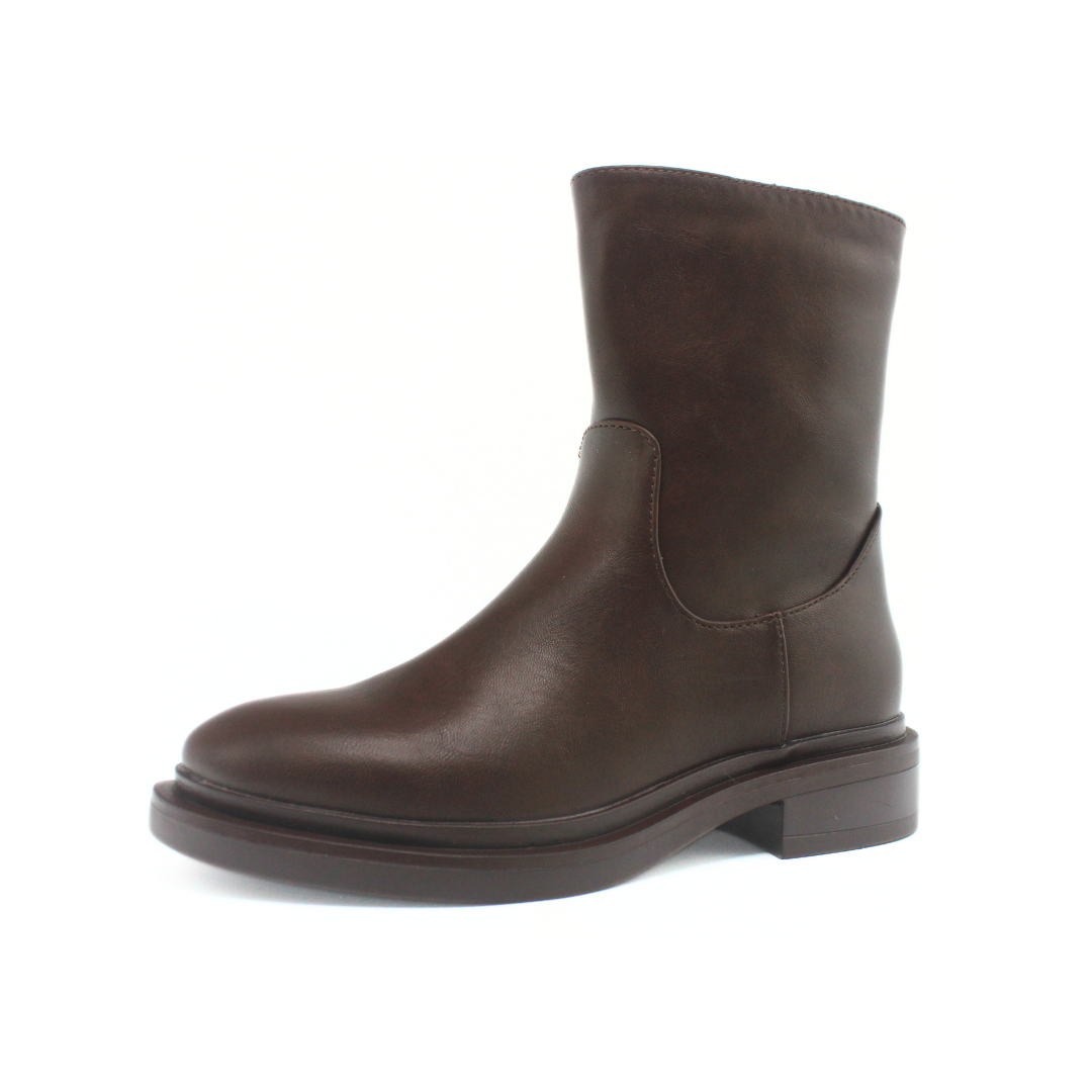 Bota con una silueta limpia y caña media que aporta un look moderno y minimalista. Presenta una capellada lisa de textura suave y un diseño sin costuras visibles en la parte frontal, creando una estética uniforme. El cierre lateral facilita el calce, mientras que la base ancha y el taco bajo ofrecen comodidad para el uso diario. Un modelo versátil para complementar outfits urbanos y de temporada.