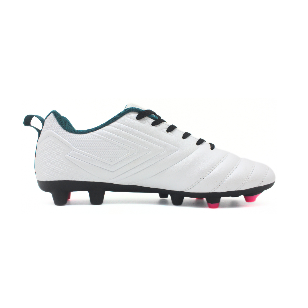 Botín de fútbol Umbro de hombre modelo Champión Vision HG, en color blanco con detalles en verde petróleo y rosa. Cuenta con capellada sintética con costuras frontales que mejoran el control del balón y ajuste con cordones clásicos. Su suela con tapones HG brinda buena tracción y estabilidad en canchas de césped natural duro o sintético. Ideal para entrenamientos y partidos.