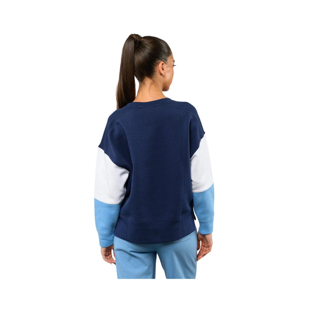 Buzo oficial de Club Nacional de Football para dama, confeccionado en tela suave y cómoda, ideal para uso diario. Presenta diseño en color azul con mangas combinadas en blanco y celeste, cuello redondo, escudo del club aplicado en el frente y logo Umbro. Ofrece un calce cómodo y abrigo liviano, ideal para vestir con estilo deportivo y orgullo tricolor.