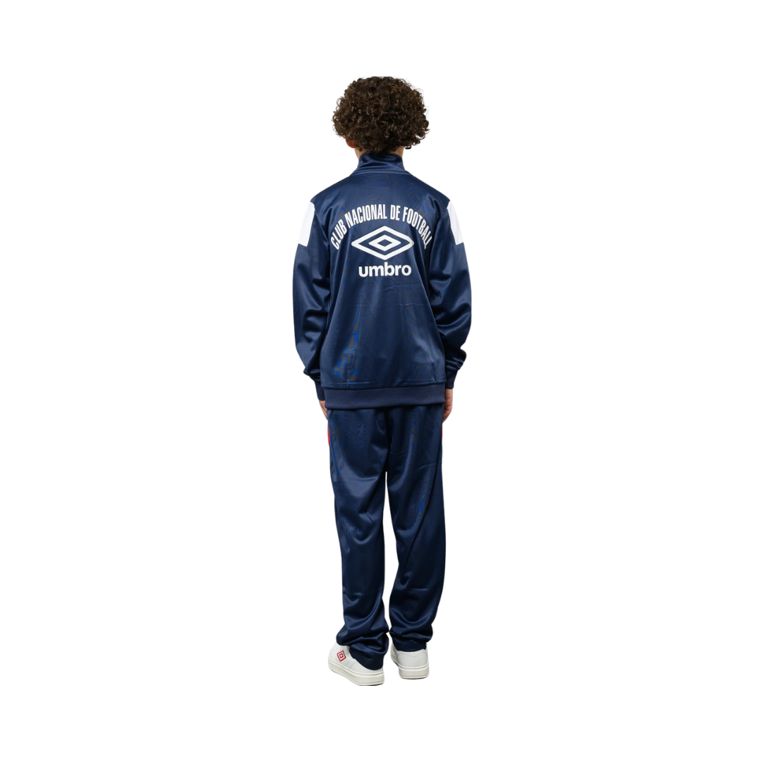 Equipo oficial de Club Nacional de Football para niños, compuesto por campera y pantalón, confeccionado en material cómodo y resistente, ideal para el uso diario y actividades deportivas. Presenta diseño en color azul con detalles en rojo y blanco, escudo del club aplicado y cierre frontal en la campera. Ofrece un calce cómodo que permite libertad de movimiento, ideal para entrenar, jugar o vestir con orgullo tricolor.