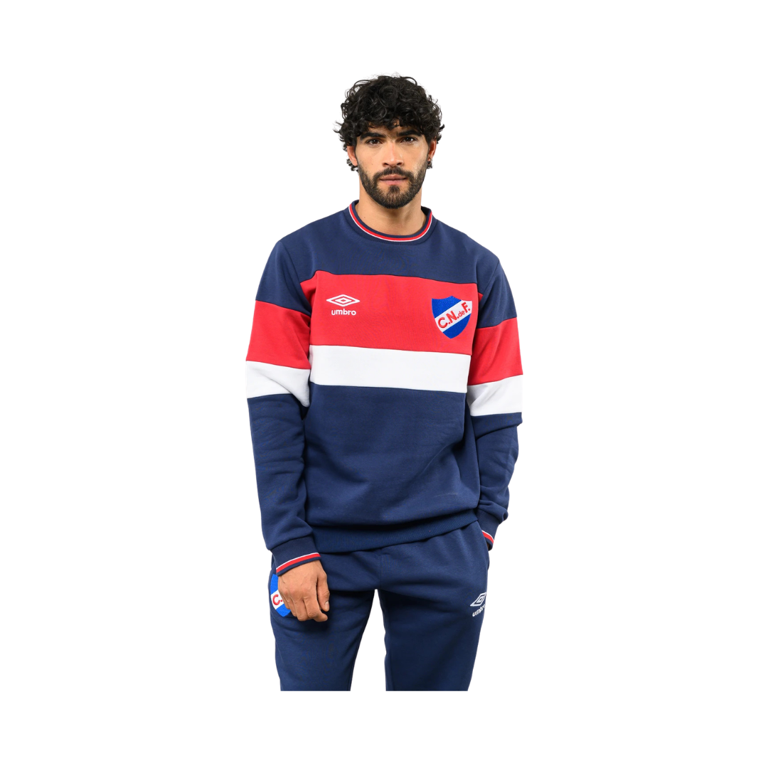 Buzo oficial de Club Nacional de Football para hombre, confeccionado en tela suave y cómoda, ideal para uso diario y actividades casuales. Presenta diseño en color azul con franjas horizontales en rojo y blanco, cuello redondo, escudo del club aplicado en el pecho y logo Umbro. Ofrece un calce cómodo y abrigo ligero, ideal para vestir con estilo deportivo y orgullo tricolor.