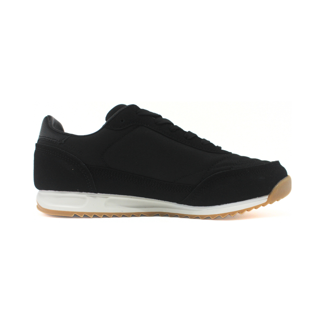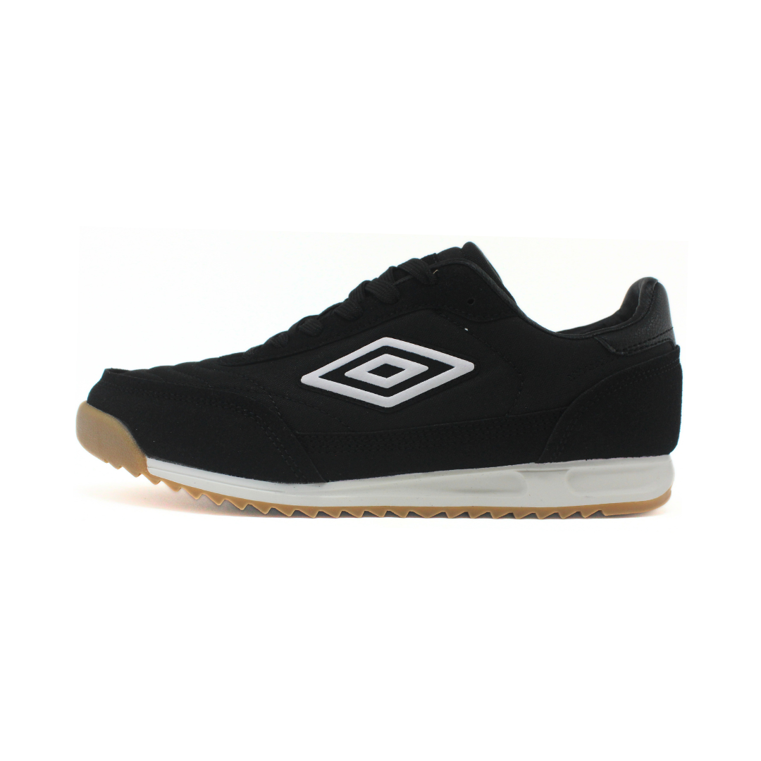 Deportivo Umbro de hombre modelo Champión Omni, en color negro con logo blanco y suela tipo goma color caramelo. Fabricada en material sintético con acabado tipo gamuza, ofrece un diseño cómodo y resistente. Su suela dentada brinda buen agarre y estabilidad, ideal para uso diario y looks urbanos casuales.