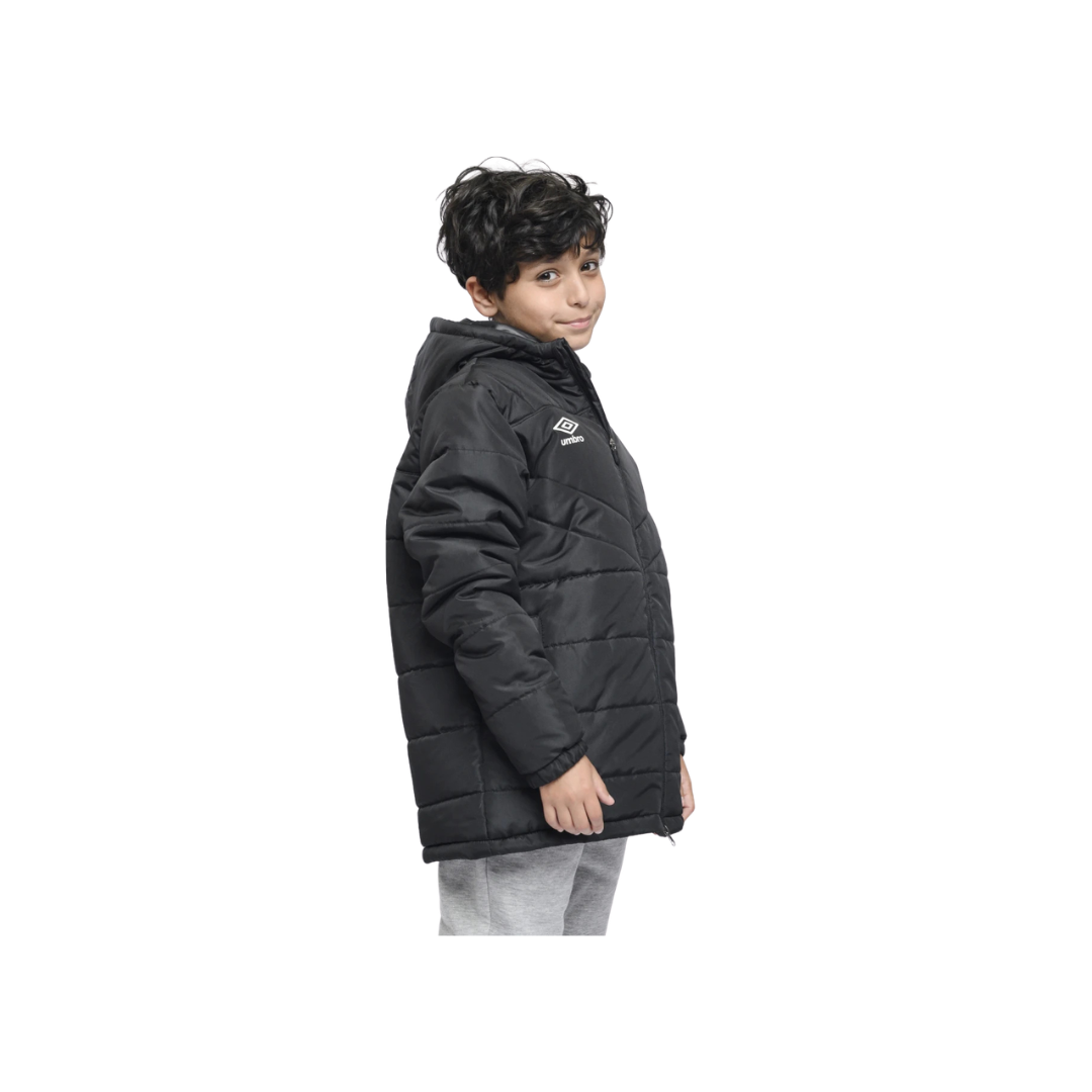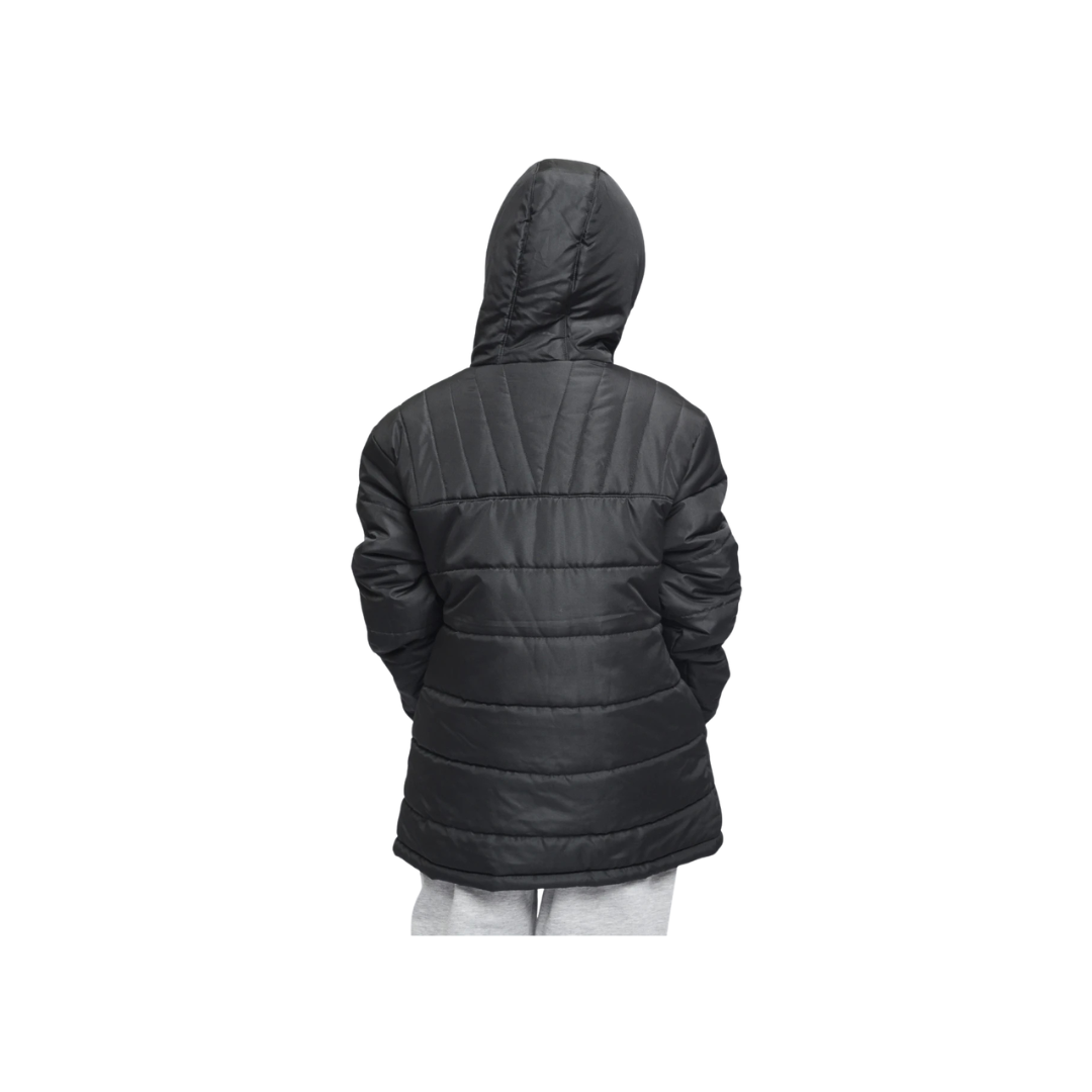Campera acolchada en color negro con un diseño de líneas diagonales y horizontales que aportan un estilo moderno. Incluye capucha integrada y cierre completo al frente. El logo Umbro aparece en el pecho como detalle distintivo. Su largo medio ofrece buena cobertura y los puños ajustados ayudan a mantener la calidez. Un modelo práctico y cómodo para días fríos y uso diario.