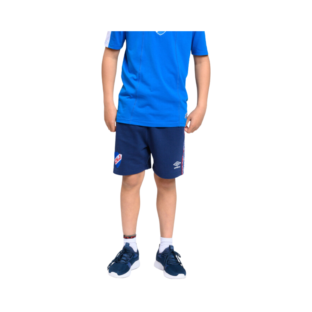 Short oficial de Club Nacional de Football para niño, confeccionado en tela liviana y cómoda, ideal para el uso diario y la actividad deportiva. Presenta diseño en color azul con detalles laterales en rojo y blanco, cintura elástica para un calce cómodo, escudo del club aplicado y logo Umbro. Ofrece libertad de movimiento y confort, ideal para jugar, entrenar o vestir con orgullo tricolor.