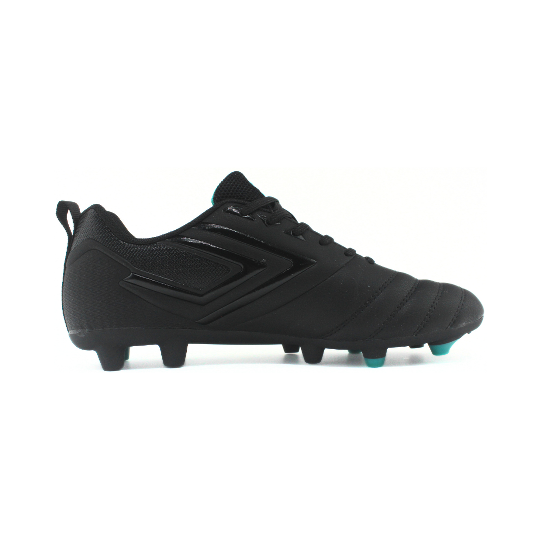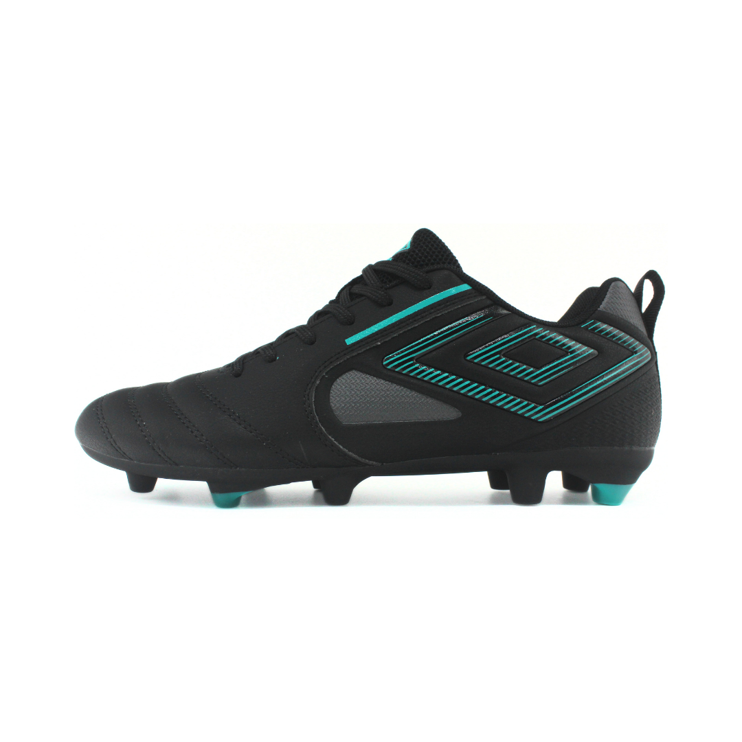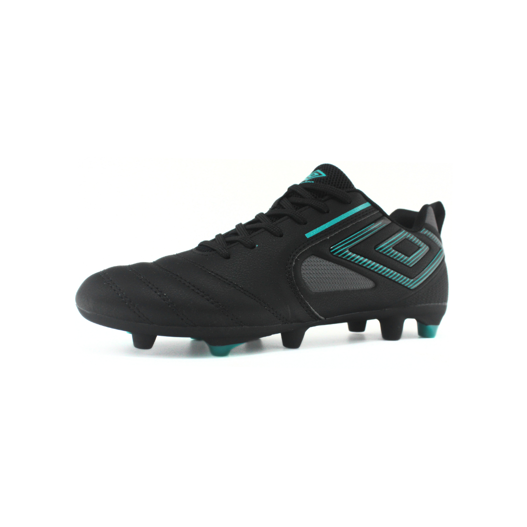 Botín de fútbol Umbro de hombre en color negro con detalles en verde agua. Cuenta con capellada sintética con costuras frontales que mejoran el control del balón y ajuste con cordones clásicos. Su suela con tapones HG brinda buena tracción y estabilidad en canchas de césped natural duro o sintético. Ideal para entrenamientos y partidos.